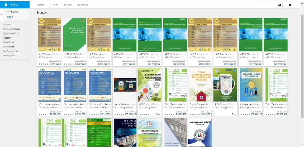 Rinfo Books adalah layanan platform Google berupa Digital Library sebagai wadah penyimpanan atas e-books dan e-journals yang berada pada Universitas Raharja. Selain sebagai wadah penyimpanan yang aman, Rinfo Books juga digunakan dalam memasarkan e-books dan e-journals tersebut sehingga dapat memaksimalkan penyebarluasannya. Pada Rinfo Books, pengguna dapat melihat pengarang, publisher, tahun terbit, serta cuplikan dari produk dalam jumlah halaman yang dibatasi dan juga dapat membeli produk tersebut untuk pengaksesan secara full version.